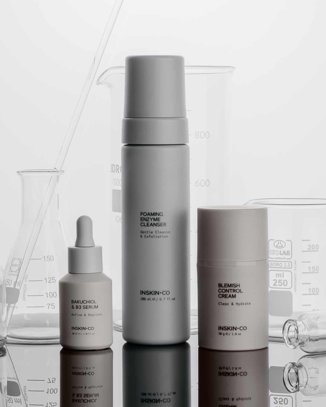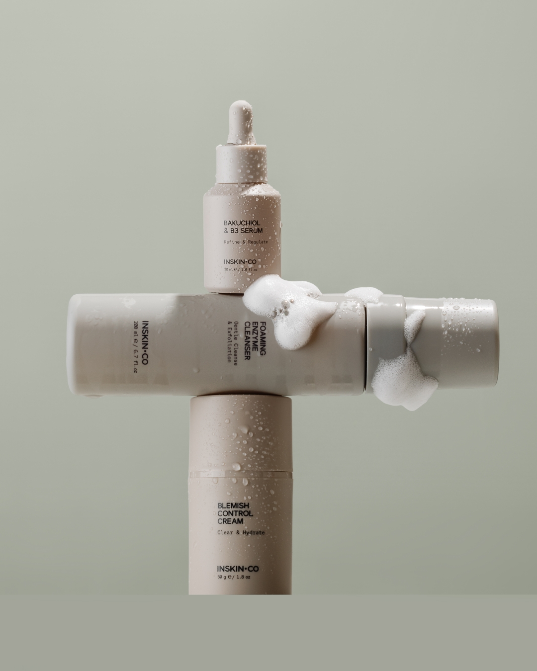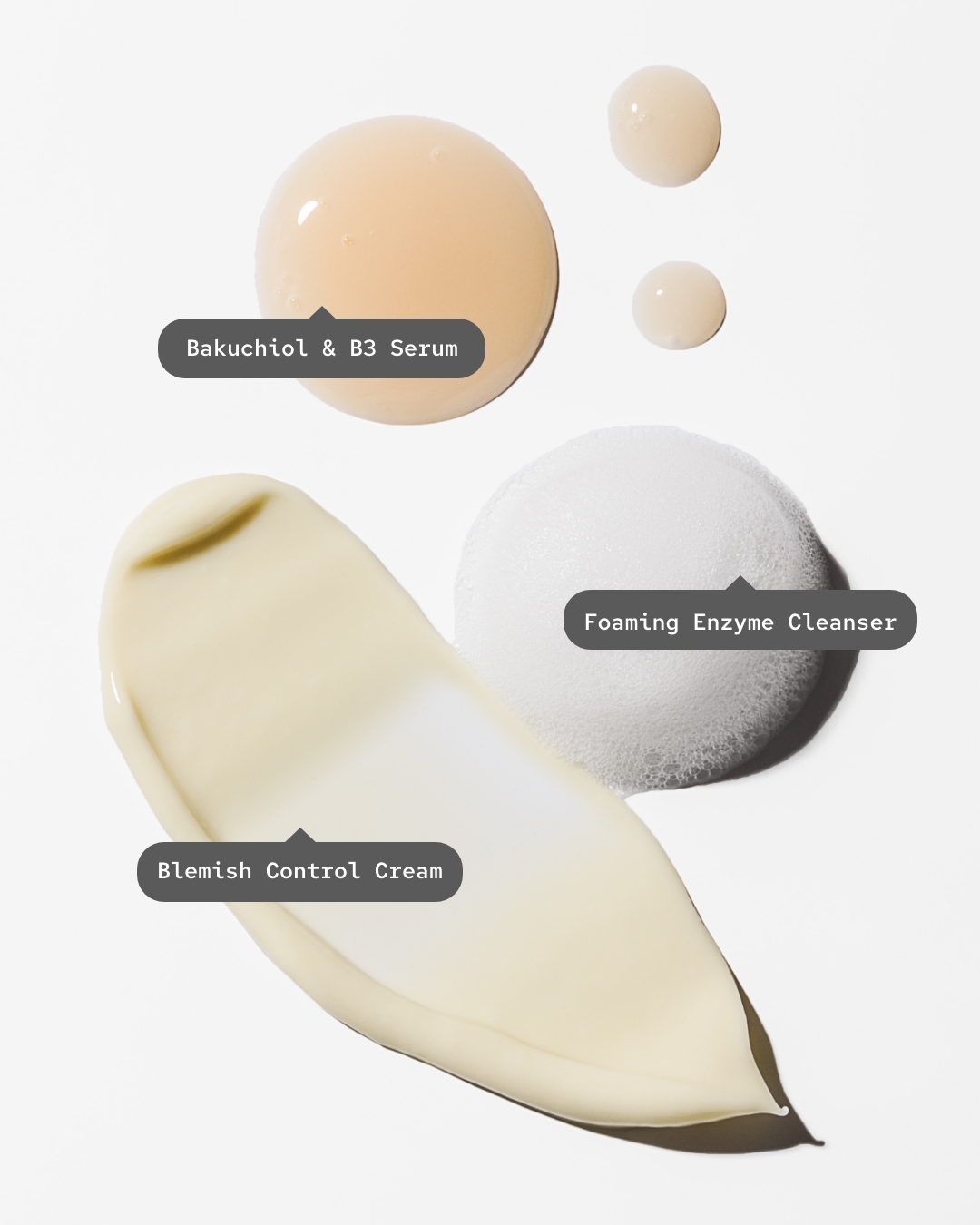 ingredients. Featuring a bamboo-based Foaming Enzyme Cleanser to detoxify and purify, a soothing Bakuchiol & B3 Serum to balance oil