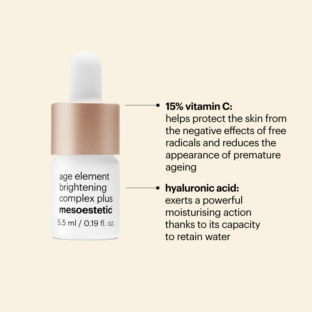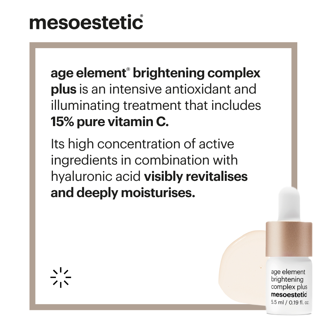 Mesoestetic Age Element Brightening Complex Plus is a high-performance skin-brightening treatment designed to fade pigmentation, boost radiance, and combat signs of aging. Powered by a potent blend of stabilized vitamin C, brightening peptides, and antioxidants, this advanced formula evens out skin tone, stimulates collagen production, and enhances skin luminosity. With regular use, it helps reduce dark spots, improve texture, and restore a youthful, healthy glow.