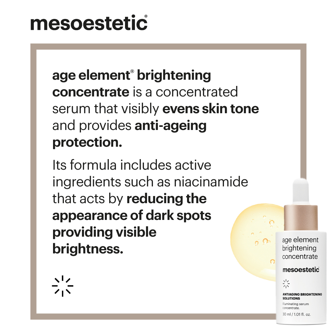 Mesoestetic Age Element Brightening Concentrate is a highly potent serum designed to illuminate, even out skin tone, and reduce signs of aging. Infused with stabilized vitamin C, brightening peptides, and powerful antioxidants, this lightweight formula works to boost collagen production, fade dark spots, and enhance skin luminosity. With continued use, your complexion appears brighter, smoother, and more youthful, with a natural, healthy glow.