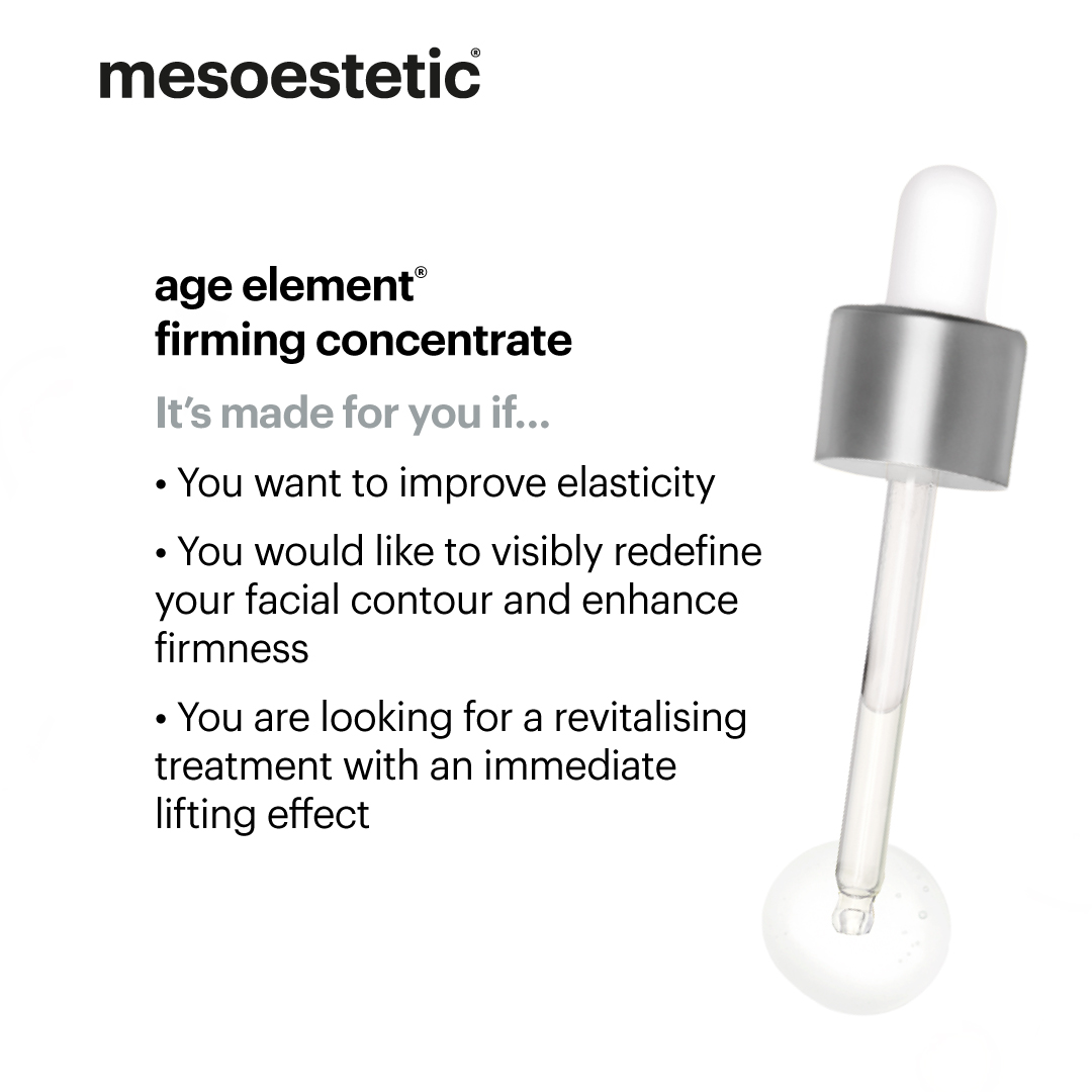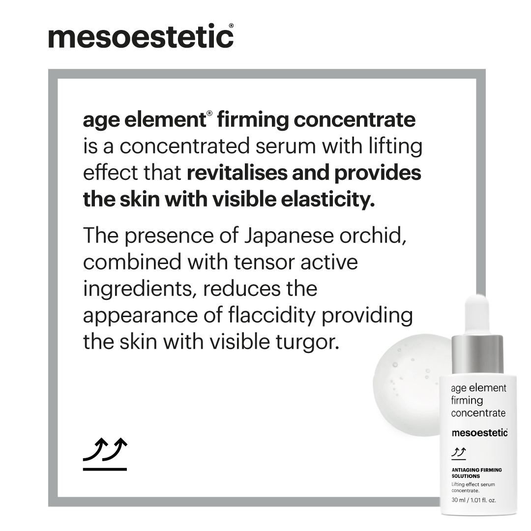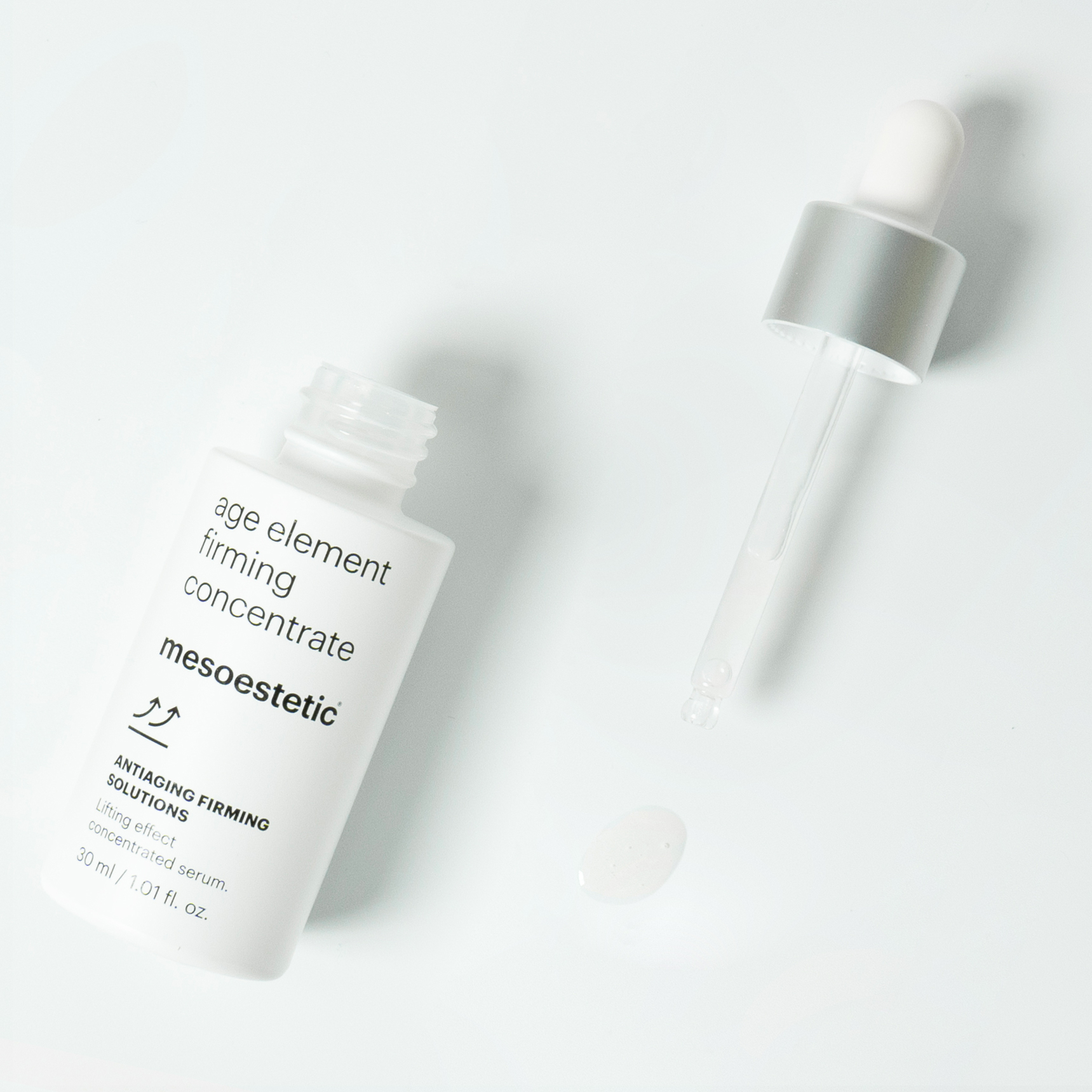 Mesoestetic Age Element Firming Concentrate is a highly potent anti-aging serum designed to tighten, lift, and redefine facial contours. Formulated with collagen-boosting peptides, firming agents, and hyaluronic acid, this lightweight yet powerful treatment works deep within the skin to restore elasticity, improve density, and smooth fine lines. With continued use, skin appears firmer, sculpted, and visibly rejuvenated.