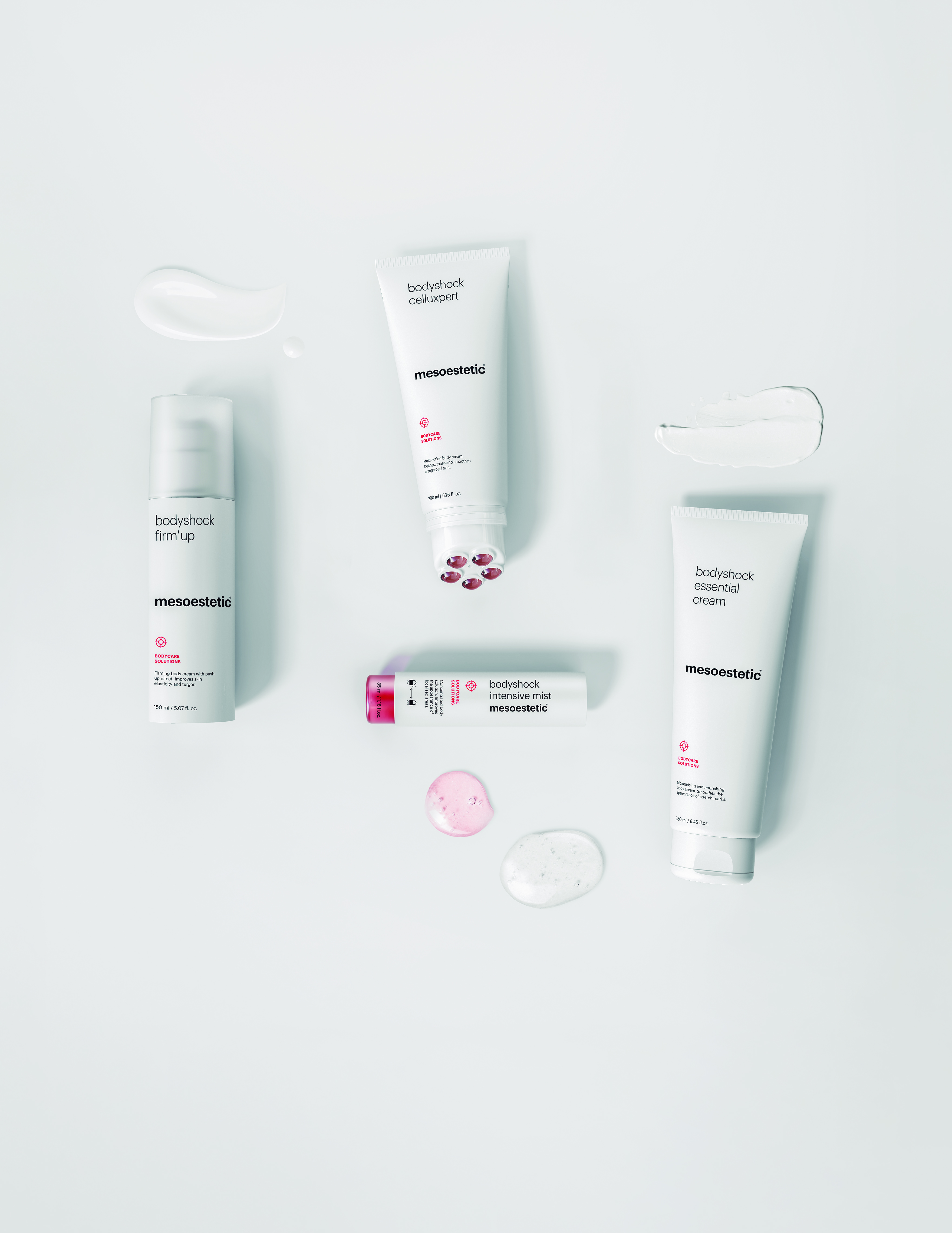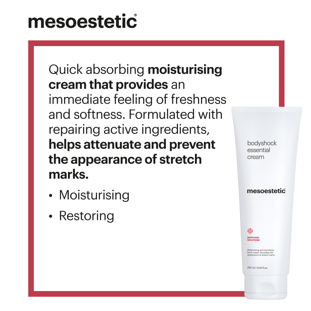 Mesoestetic Bodyshock Essential Cream is a luxuriously hydrating and firming body moisturizer designed to nourish, smooth, and improve skin elasticity. Infused with hydrating agents, firming peptides, and antioxidant-rich botanical extracts, this lightweight yet deeply nourishing formula helps to restore suppleness, protect against dryness, and enhance skin tone. With a silky texture that absorbs quickly, it leaves the skin feeling soft, toned, and refreshed all day long.