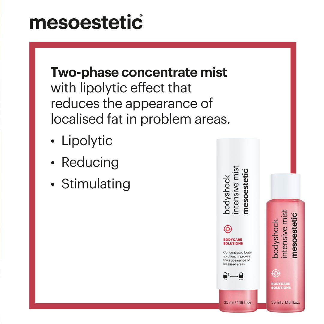 Mesoestetic Bodyshock Intensive Mist is a lightweight, fast-absorbing body treatment designed to firm, tone, and energize the skin. Infused with a potent blend of caffeine, botanical extracts, and firming peptides, this invigorating mist helps to reduce fluid retention, improve circulation, and enhance skin elasticity. Its refreshing formula absorbs instantly, making it perfect for daily use or post-exercise application to maintain smooth, toned, and revitalized skin.