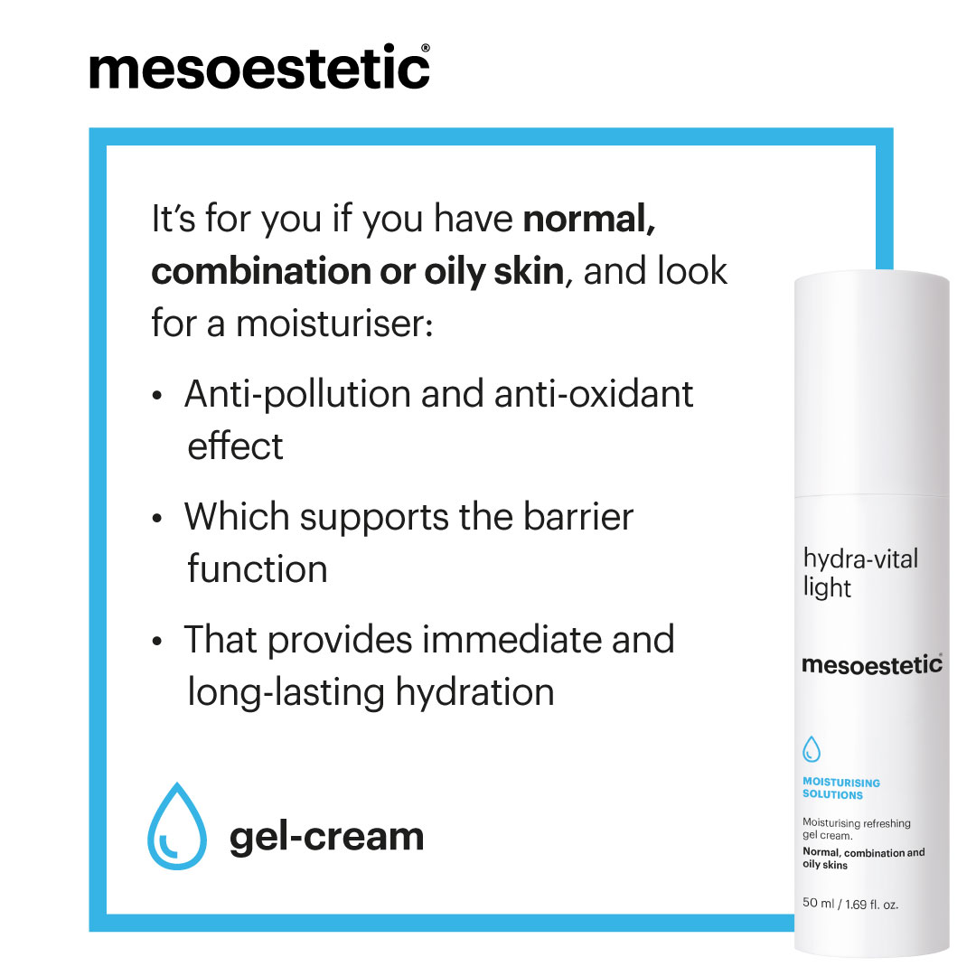 Mesoestetic Hydra-Vital Light is an ultra-hydrating, fast-absorbing moisturizer designed to replenish moisture, soothe the skin, and strengthen its natural barrier. This lightweight yet deeply nourishing formula delivers long-lasting hydration without a greasy feel, making it perfect for daily use. Infused with powerful antioxidants and skin-repairing ingredients, it helps to improve elasticity, protect against environmental damage, and leave your complexion soft, smooth, and beautifully radiant.