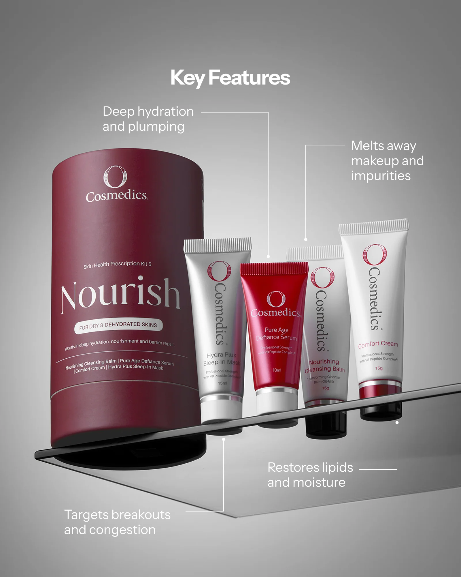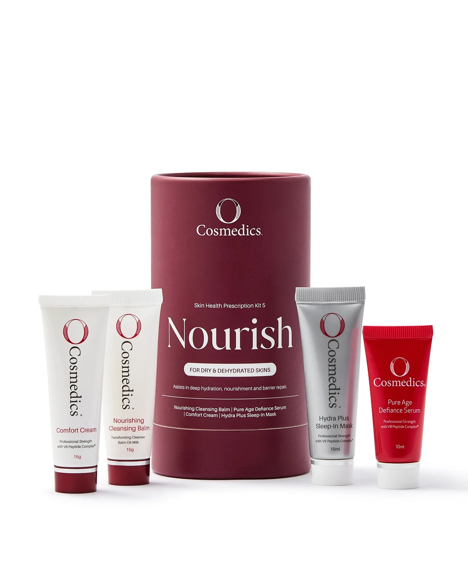 The Nourishing Skin Kit is a complete, travel-sized skincare routine designed to deeply hydrate, restore and strengthen dry, dehydrated skin. This four-step system works together to replenish essential lipids and deliver intense hydration for soft, supple, and plump skin. Powered by biomimetic oils, peptides, hyaluronic hydration and multi-vitamins, it supports skin barrier repair while improving overall resilience and radiance. It’s the perfect introduction to professional skincare, delivering visible nourishment and comfort in every step.