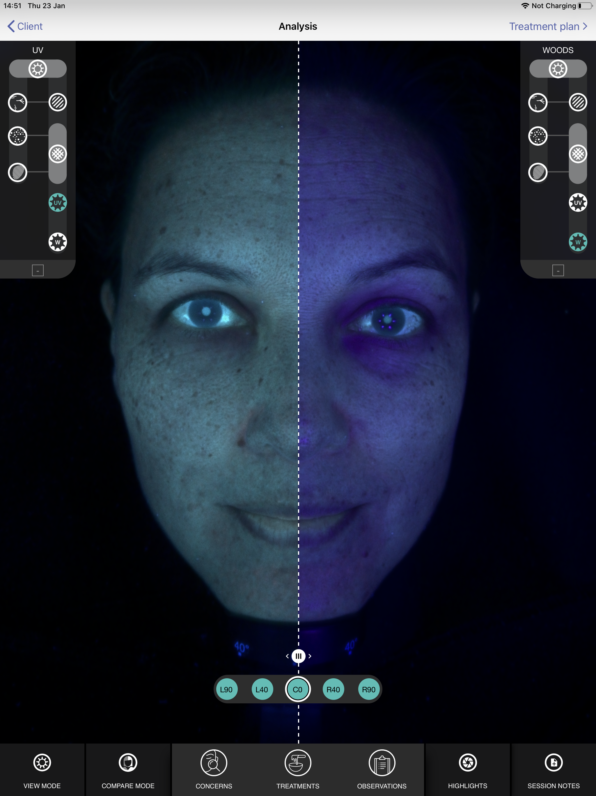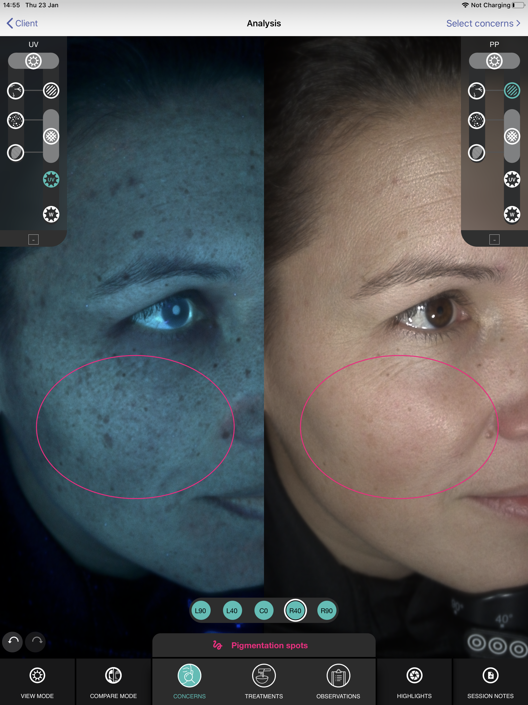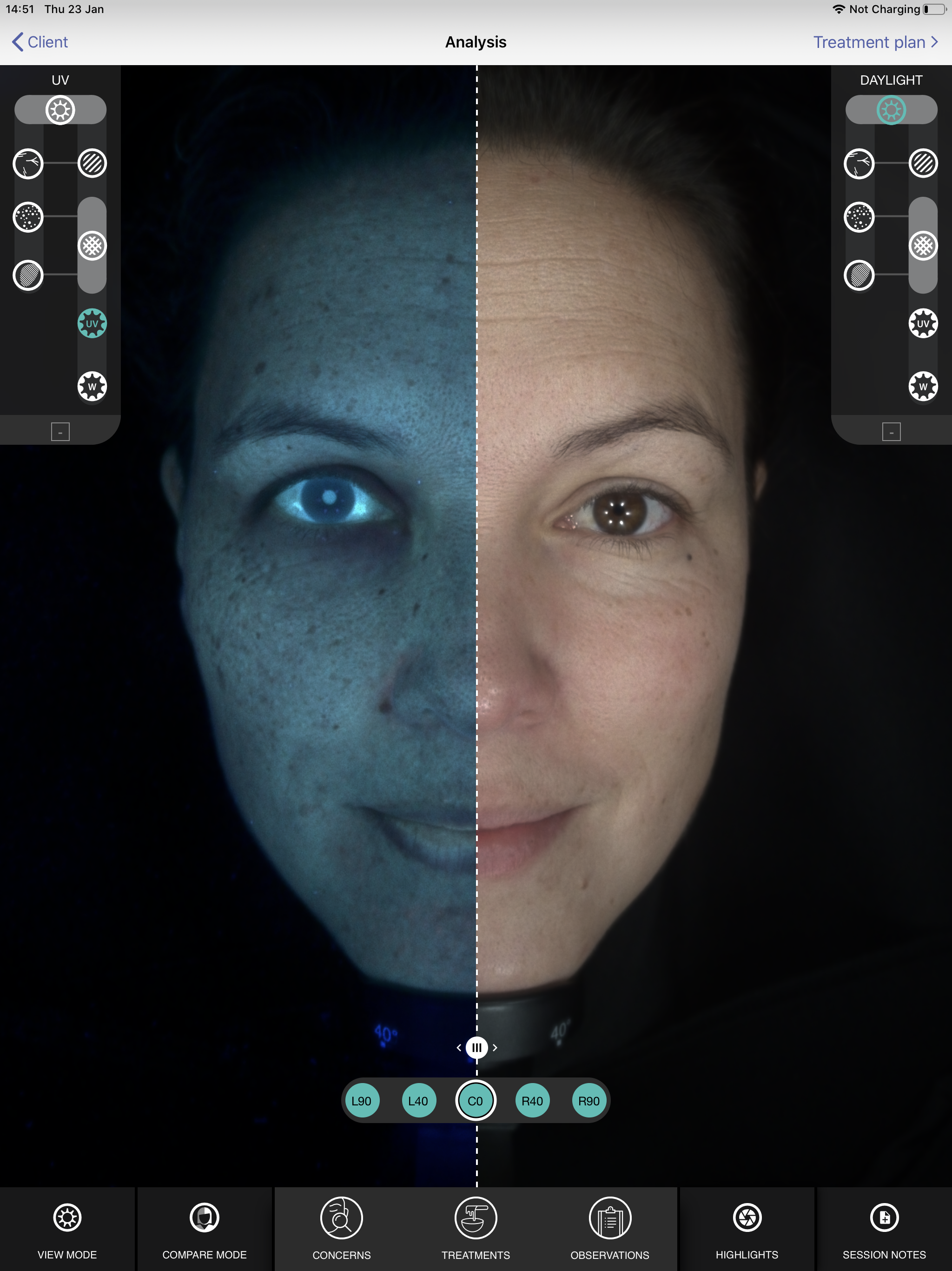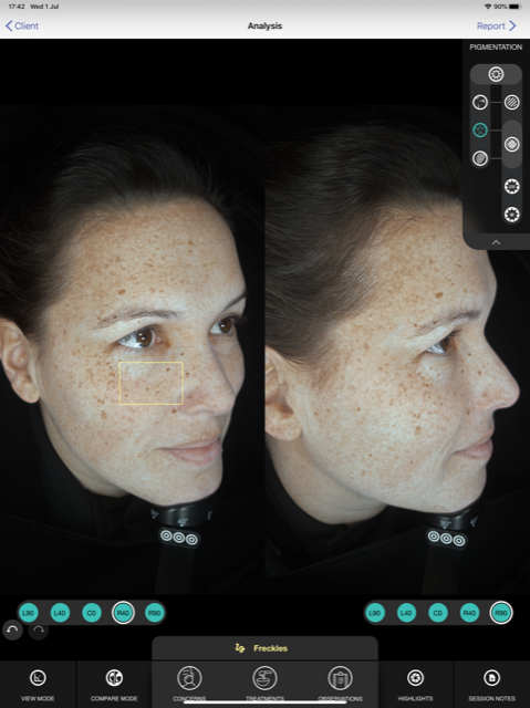 The OBSERV 520x uses a series of specialised light modes, including daylight, polarised, and fluorescence illumination, to visualise different layers of your skin. These images allow your therapist to detect early signs of damage, assess skin functions, and track changes over time.